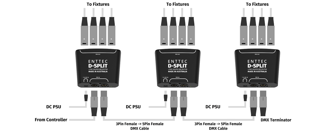 Instead of having to make all fixtures fit within a single daisy chain, each of the four outputs from the D-Split can be the start of its own chain, and multiple D-Splits can be linked together to expand further.