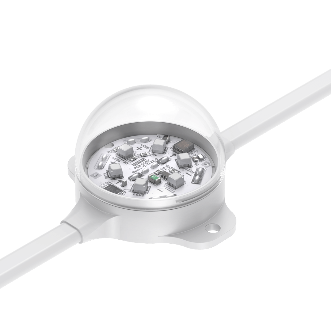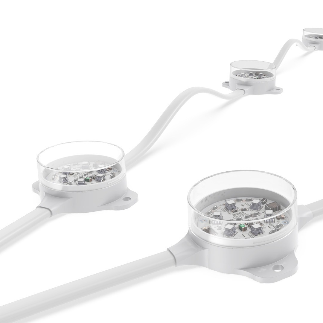Flexible strings of ultra-bright, high-resolution 42mm RGB or RGBW LED dots — available in black or white finishes — with robust, injection-moulded cases for all-weather use.