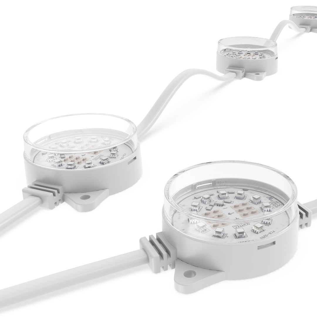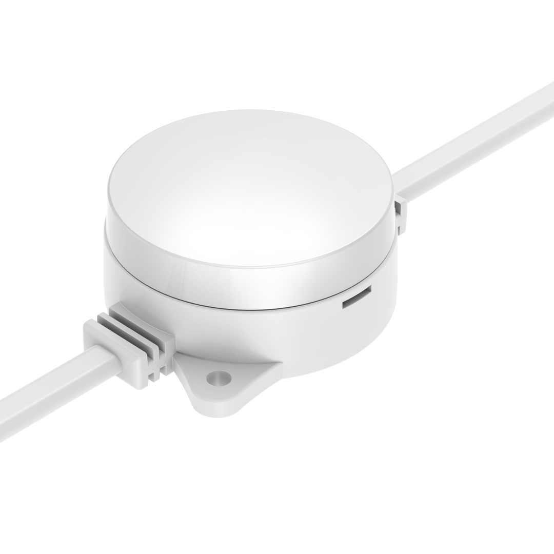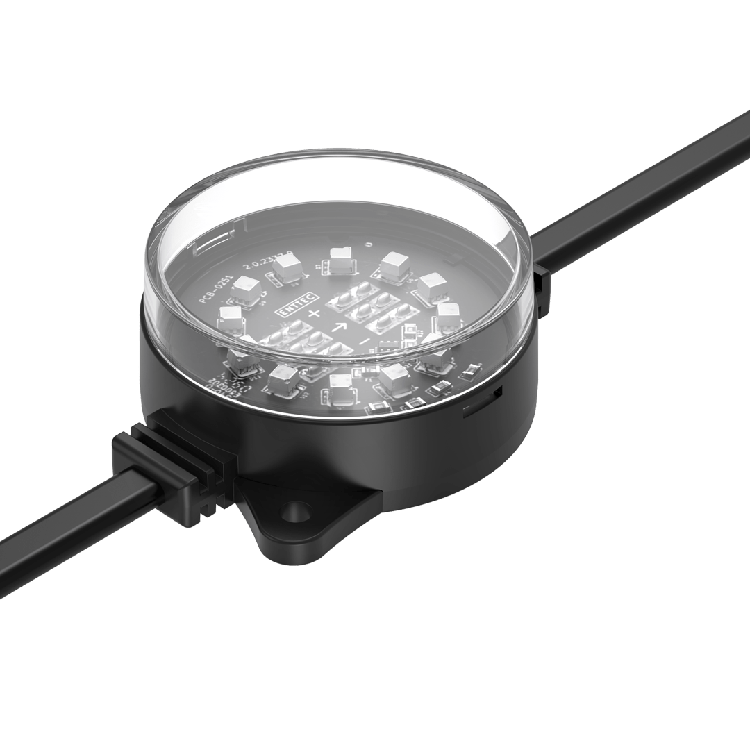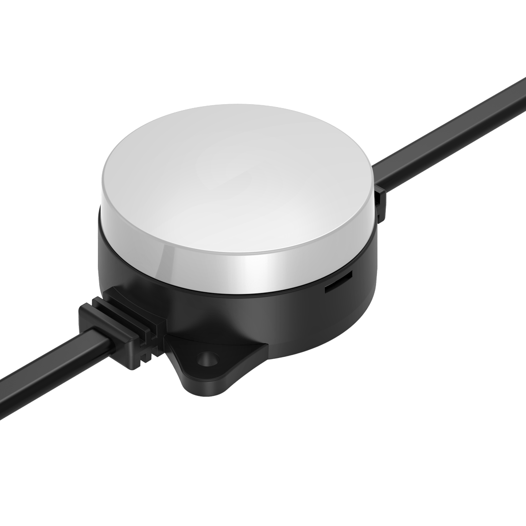 Flexible strings of ultra-bright, high-resolution 55.5mm RGB or RGBW LED dots — available in black or white finishes — with robust, injection-moulded cases for all-weather use.