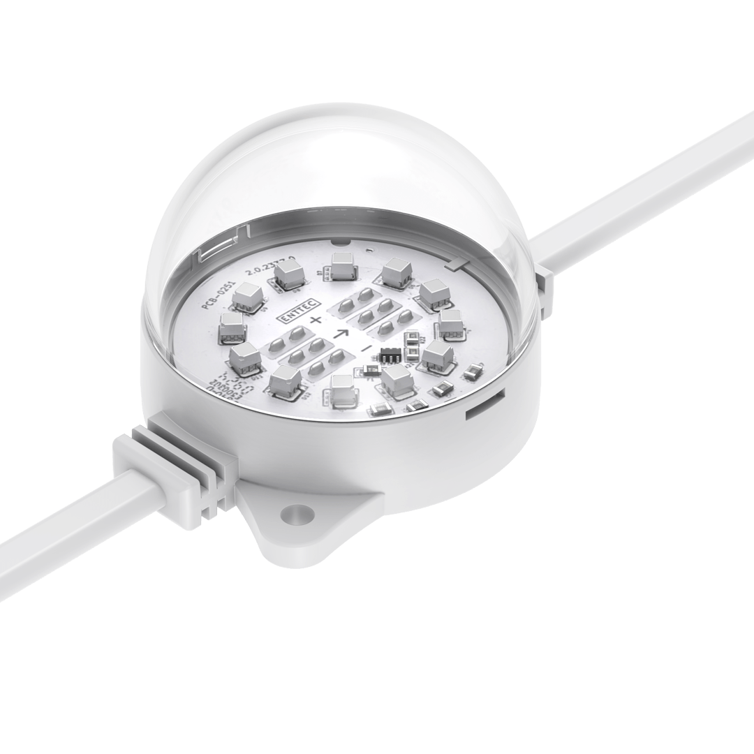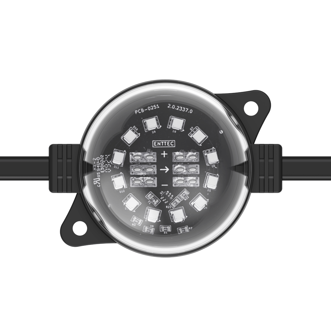 ENTTEC’s robust, high-resolution Smart PXL 60 dots are built to endure harsh environments and offered in both black and white finishes to suit a variety of design needs. Easily installed in any shape, these 55.5mm direct-view Smart PXL dots deliver crisp, dramatic lighting effects while enhancing design. Custom spacing and voltage options are available to fit various projects. Engineered by professionals for professionals, the Smart PXL range elevates architectural, commercial, and entertainment projects. Each string is made to order at our factory using cutting-edge manufacturing techniques, then shipped globally.