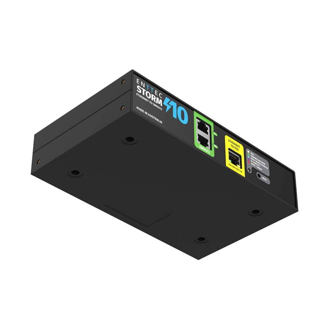 The Storm10 is a compact, 10-universe Ethernet-to-DMX converter, converting sACN, Art-Net, or ESP protocols to DMX512 with ease. Mount it using one of four options, and configure or update remotely via its intuitive web interface. It features 10 outputs and 2 front-facing ports for flexible cabling and future expansion. With an internal buffer and sync logic, the Storm10 ensures smooth, jitter-free LED matrix displays and perfect synchronization across your show. Reliable and predictable performance every time.